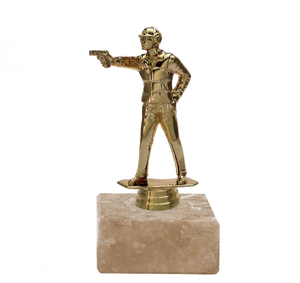 Soška střelba pistole F015 zlato na mramorovém podstavci, výška s podstavcem 16 cm. Maximální velikost potisku štítku na podstavec je 60 x 25 mm.