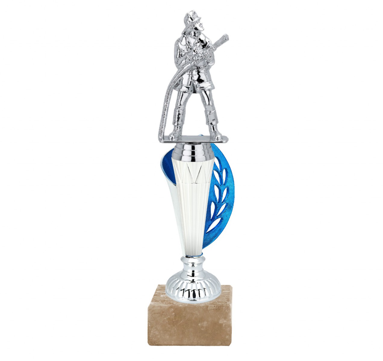 Soška T08.2 hasič na podstavci, barva stříbro - modrá, výška se soškou hasič je 28 cm s možností umístění emblému 25 mm na přední stranu nebo VLASTNÍ KRUHOVÝ ŠTÍTEK o průměru 25 mm s černým nebo barevným laserovým potiskem na tvrdém podkladu. Na tyto štítky lze umístnit logo dle Vašeho návrhu nebo obrázek dle výběru z naší nabídky. Maximální velikost potisku štítku na podstavec je 60 x 25 mm. Cena trofeje je bez emblému.