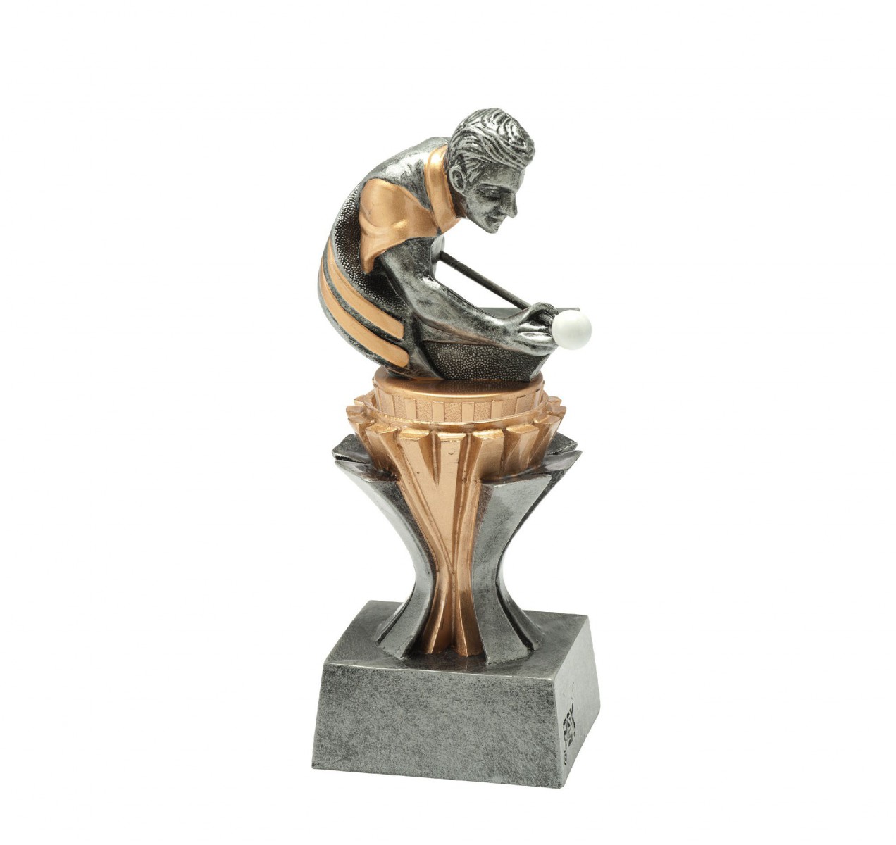 Sportovní trofej FX010.3 kulečník / billiard /, trofej se soškou o výšce 17 cm, barva nohy stříbrná/zlatá. Maximální velikost potisku štítku na podstavec je 50 x 20 mm