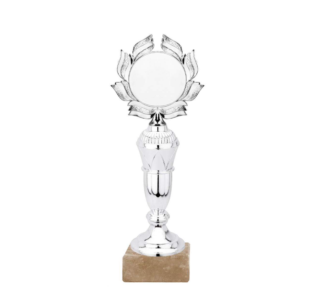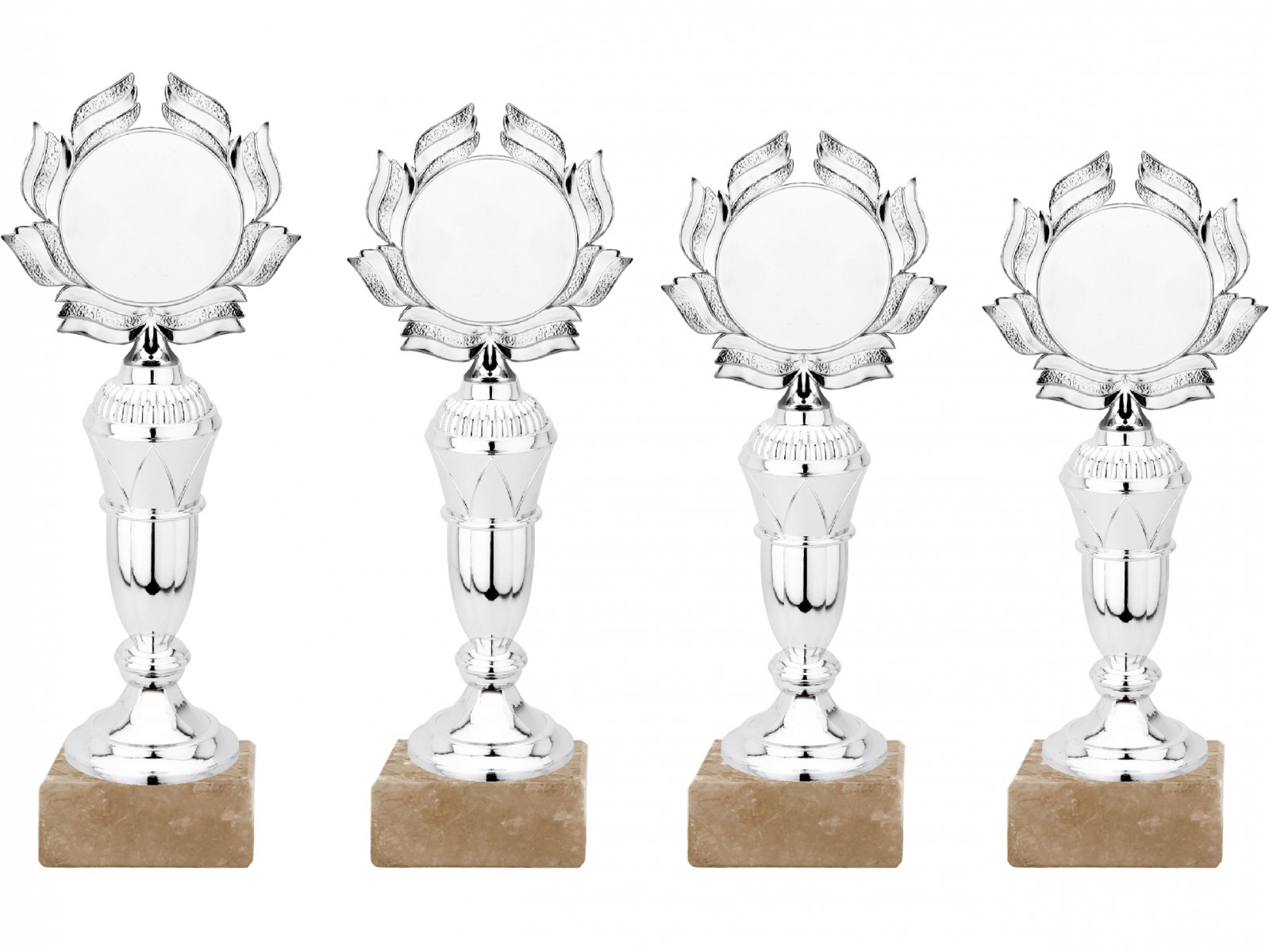 Plakety P006 SILVER sada 4 výškově odstupňovaných plaket, barva stříbrná, výška 27 cm; 25 cm; 23 cm, 21 cm, s terčem 50 mm s možností umístění emblému 50 mm, barva nohy stříbrná. Maximální velikost potisku štítku na podstavec je 75 x 25 mm.