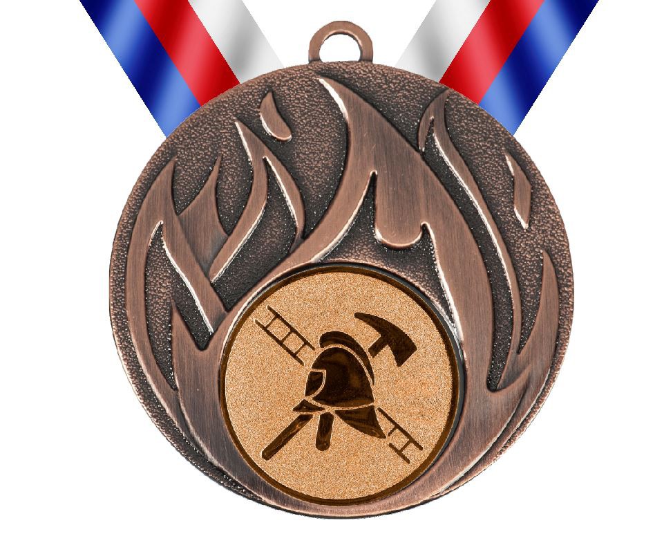 Medaile MD49 hasič bronz s trikolórou 22 x 800 mm na kovové karabině; průměr medaile 50 mm s emblémem 25 mm hasič, možnost umístění na zadní stranu medaile kruhový štítek s vlastním textem nebo logem o maximálním průměru 45 mm na fólii s černým nebo barevným laserovým potiskem. Na tyto štítky lze umístnit logo dle Vašeho návrhu nebo obrázek s vlastním textem. Cena medaile je včetně hasičského emblému.