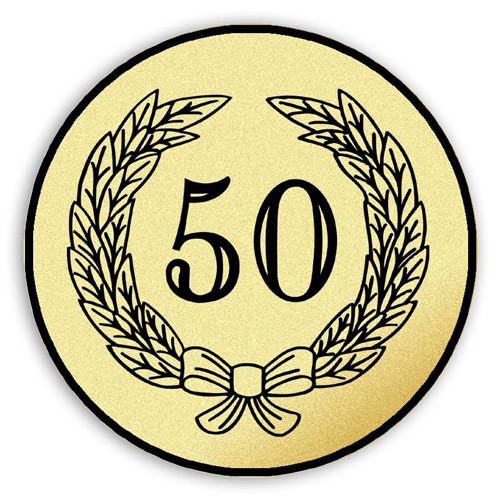 Tištěný emblém výročí 50. let, průměr 25 mm. Jedná se o zlatou samolepku s černým potiskem. Emblémy se lepí do medailí, kokard, plaket, trofejí a na víka pohárů.