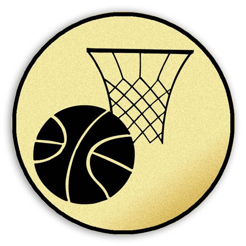 Tištěný emblém basketbal průměr 50 mm. Jedná se o zlatou samolepku s černým potiskem. Emblémy se lepí do medailí, kokard, plaket, trofejí a na víka pohárů.