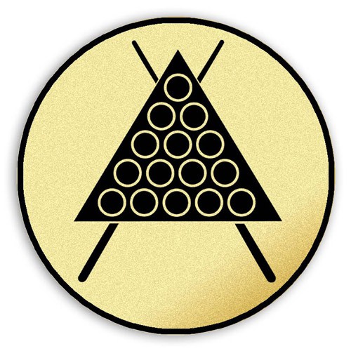 Tištěný emblém kulečník, průměr 50 mm. Jedná se o zlatou samolepku s černým potiskem. Emblémy se lepí do medailí, kokard, plaket, trofejí a na víka pohárů.