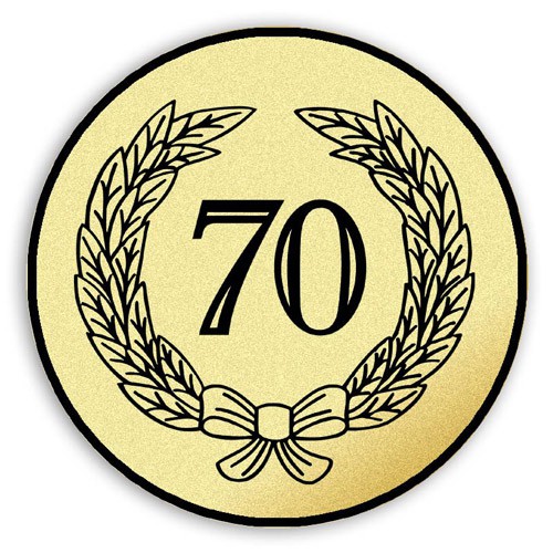 Tištěný emblém výročí 70. let, průměr 50 mm. Jedná se o zlatou samolepku s černým potiskem. Emblémy se lepí do medailí, kokard, plaket, trofejí a na víka pohárů.