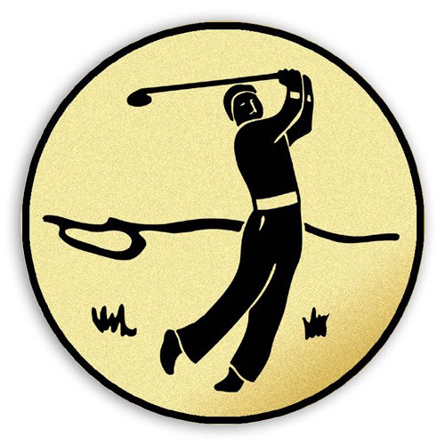 Tištěný emblém golfové hřiště, průměr 60 mm. Jedná se o zlatou samolepku s černým potiskem. Emblémy se lepí do medailí, kokard, plaket, trofejí a na víka pohárů.