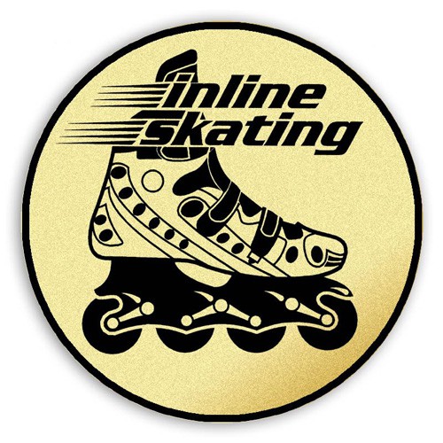 Tištěný emblém in-line brusle, průměr 60 mm. Jedná se o zlatou samolepku s černým potiskem. Emblémy se lepí do medailí, kokard, plaket, trofejí a na víka pohárů.