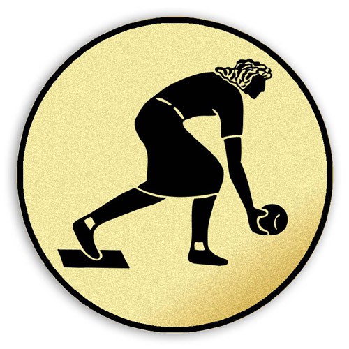 Emblém tištěný kuželky žena, rozměr 60 mm. Jedná se o zlatou samolepku s černým potiskem. Emblémy se lepí do medailí, kokard, plaket, trofejí a na víka pohárů.