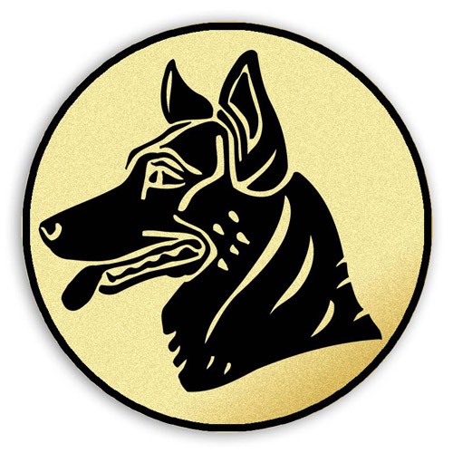 Tištěný emblém pes průměr 60 mm. Jedná se o zlatou samolepku s černým potiskem. Emblémy se lepí do medailí, kokard, plaket, trofejí a na víka pohárů.