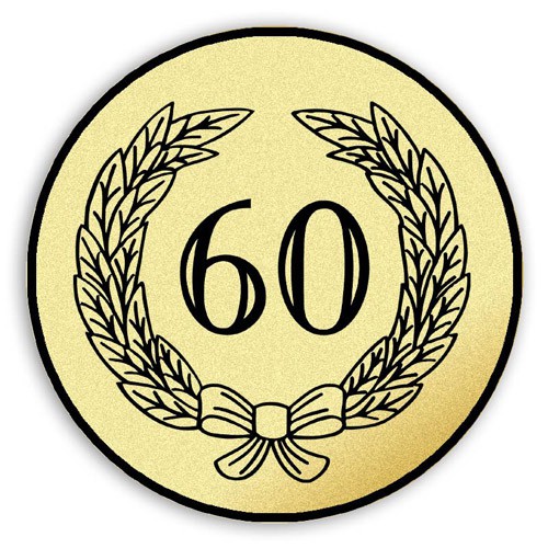 Tištěný emblém výročí 60. let, průměr 70 mm. Jedná se o zlatou samolepku s černým potiskem. Emblémy se lepí do medailí, kokard, plaket, trofejí a na víka pohárů.