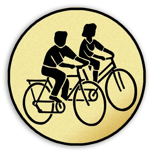 Tištěný emblém cyklistika; průměr 100 mm. Jedná se o zlatou samolepku s černým potiskem. Emblémy se lepí do medailí, kokard, plaket, trofejí a na víka pohárů.
