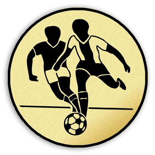 Tištěný emblém fotbal muž průměr 100 mm. Jedná se o zlatou samolepku s černým nebo barevným laserovým potiskem na tvrdém plastovém podkladu, tepelně laminovaný ve fólii, aby nedošlo k poškození tištěného textu. Emblémy se umistňují do medailí, kokard, plaket, trofejí a na víka pohárů.