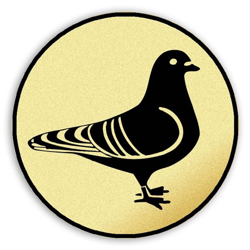 Tištěný emblém holubi průměr 100 mm. Jedná se o zlatou samolepku s černým potiskem. Emblémy se lepí do medailí, kokard, plaket, trofejí a na víka pohárů.