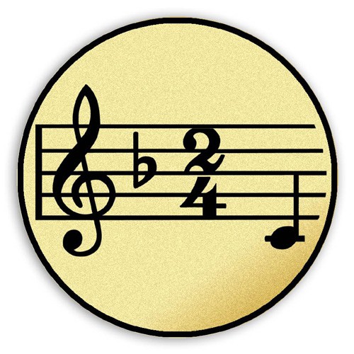 Tištěný emblém noty, průměr 100 mm. Jedná se o zlatou samolepku s černým potiskem. Emblémy se lepí do medailí, kokard, plaket, trofejí a na víka pohárů.