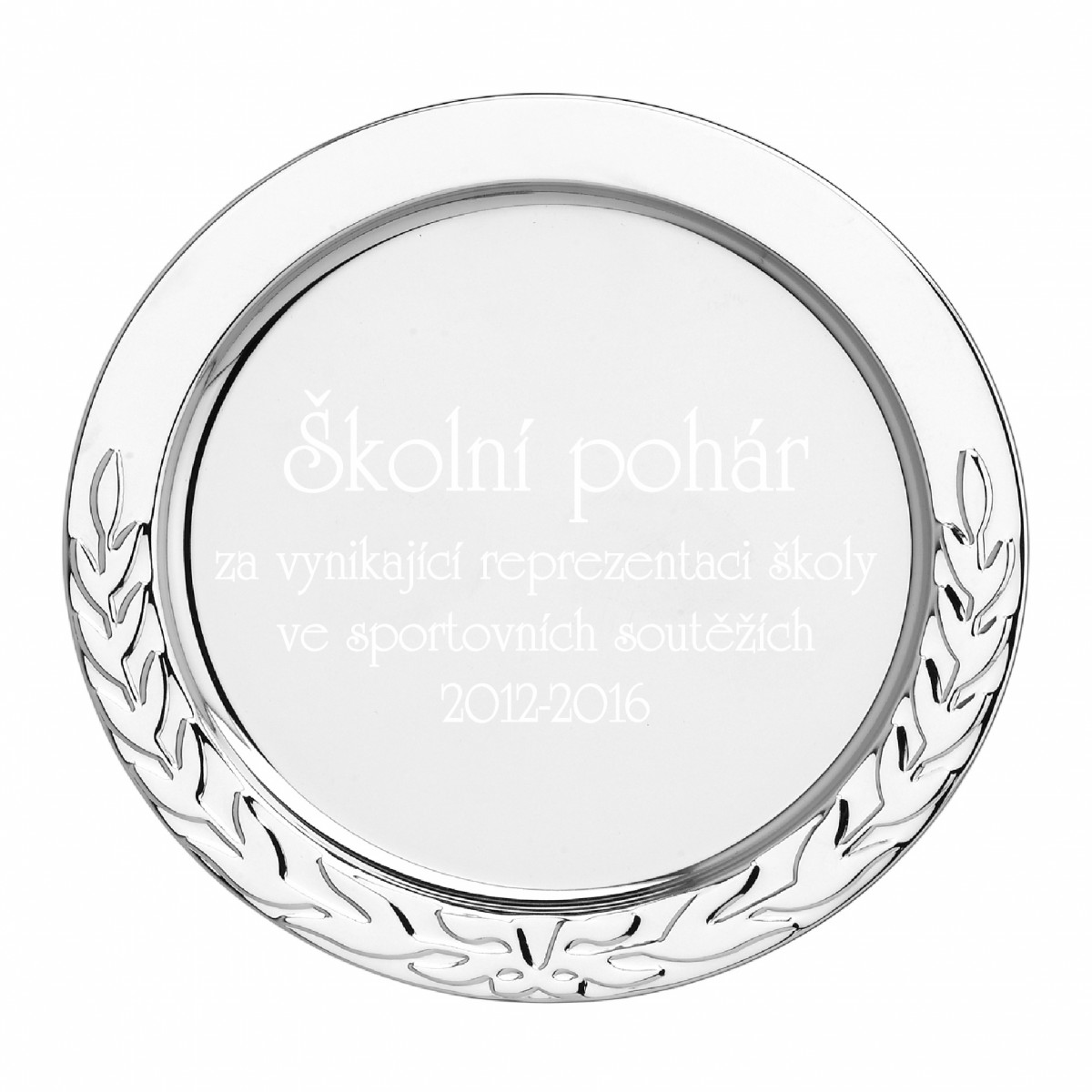 Stříbrný talíř T180 o průměru 10 cm, po obvodu jsou stříbrné snítky vavřínu. Do talíře je možné rytí textu nebo loga. Talíř lze umístit na stojánek, který není v ceně talíře. Cena talíře je bez emblému včetně gravírování.