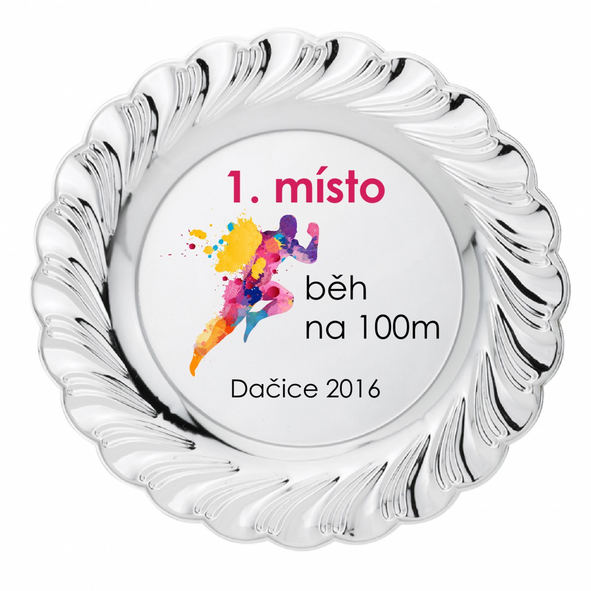 Stříbrný talíř T201 o průměru 25 cm. Po obvodu jsou stříbrné výlisky. Plnobarevný potisk v ceně. Talíř lze umístit na STOJÁNEK nebo do DÁRKOVÉ SATÉNOVÉ KRABIČKY. emblému. Talíř lze umístit na stojánek, který není v ceně talíře. Cena talíře je bez emblému a gravírování.