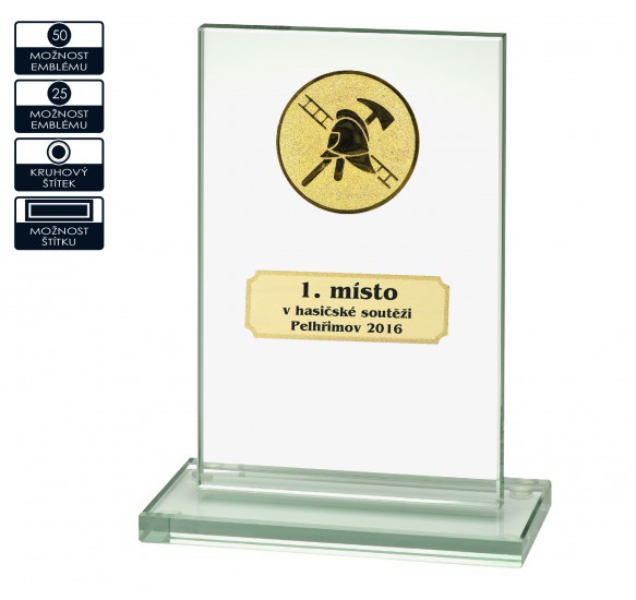 Skleněná trofej D153 o velikosti 150 x 200 mm o síle skla 10 mm s možností umístnění do středu trofeje emblém o průměru 25 mm nebo 50 mm. Maximální velikost potisku štítku trofej je 73 x 27 mm. Cena skleněná trofeje je bez emblému a štítku.