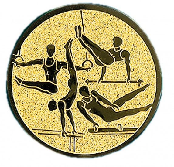 Kovový emblém gymnastika muž, průměr 50 mm; provedení zlato. Emblémy se umistňují na medaile, plakety, trofeje, kokardy a na víka pohárů.