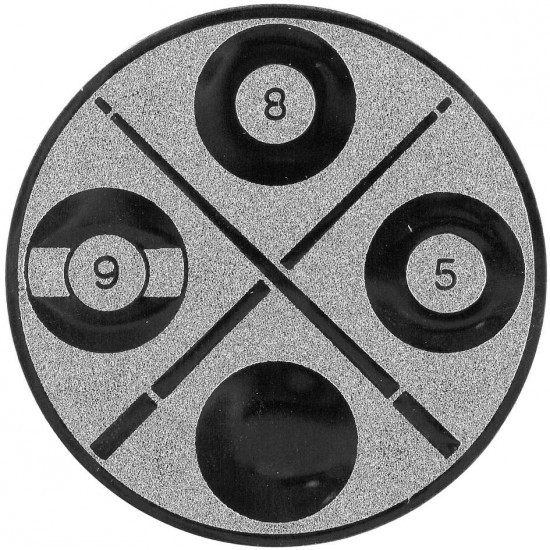 Kovový emblém kulečník, průměr 50 mm; provedení stříbro. Emblémy se umistňují na medaile, plakety, trofeje, kokardy a na víka pohárů.