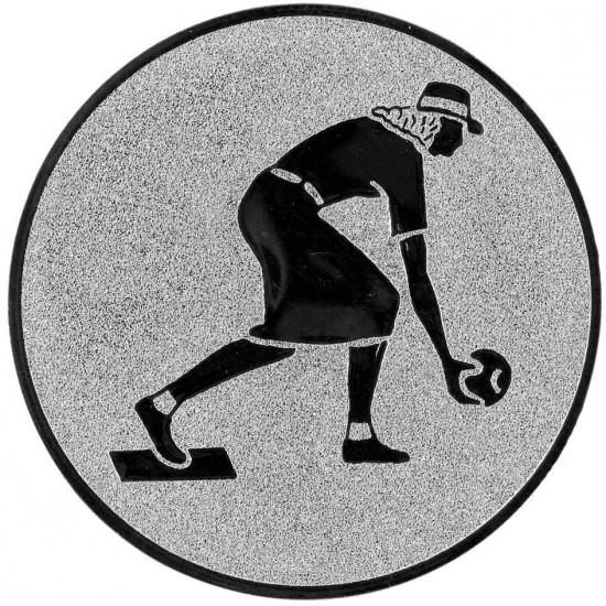 Kovový emblém kuželky - žena, průměr 50 mm; provedení stříbro. Emblémy se umistňují na medaile, plakety, trofeje, kokardy a na víka pohárů.