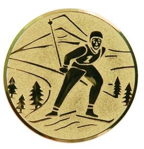 Kovový emblém lyžování běžky; průměr 50 mm; provedení zlato. Emblémy se umistňují do medailí, kokard, plaket, trofejí a na víka pohárů.