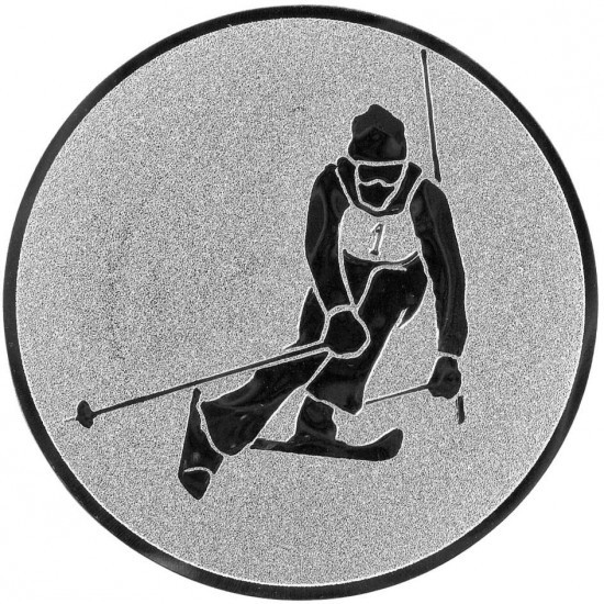 Kovový emblém lyžování sjezd - slalom; průměr 50 mm; provedení stříbro. Emblémy se umistňují do medailí, plaket, trofejí a na víka pohárů.