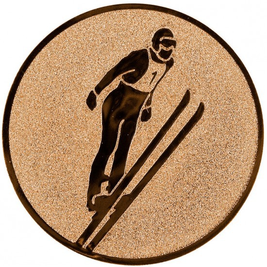 Kovový emblém skoky na lyžích, průměr 50 mm; provedení bronz. Emblémy se umistňují do medailí, kokard, plaket, trofejí a na víka pohárů.