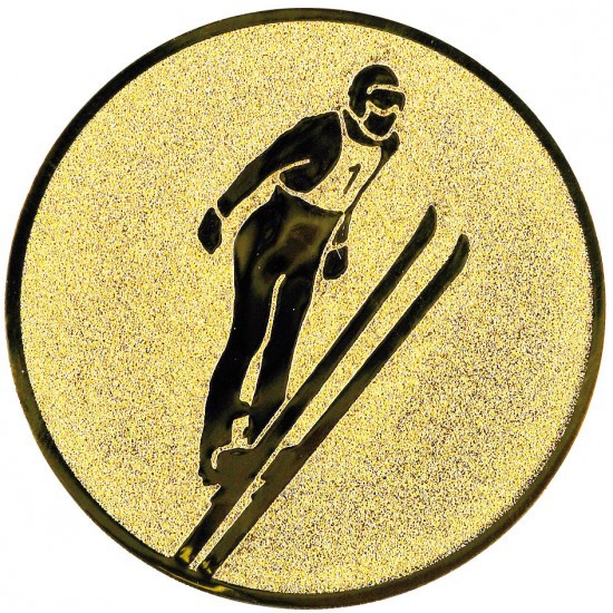 Kovový emblém skoky na lyžích, průměr 50 mm; provedení zlato. Emblémy se umistňují do medailí, kokard, plaket, trofejí a na víka pohárů.