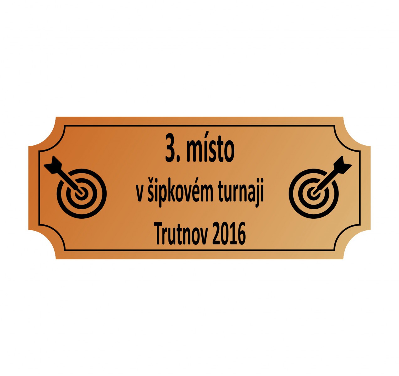 Štítek laserový bronz s ozdobnými rohy. Jedná se o zlatou samolepicí fólii o rozměrech 75 x 25 mm, síla fólie je 0,2 mm s černým laserovým gravírováním dle Vašich požadavků. Na tyto štítky lze umístnit logo dle Vašeho návrhu nebo obrázek. Laserové štítky se umísťují na přední stranu podstavce poháru, plaket nebo sošek.