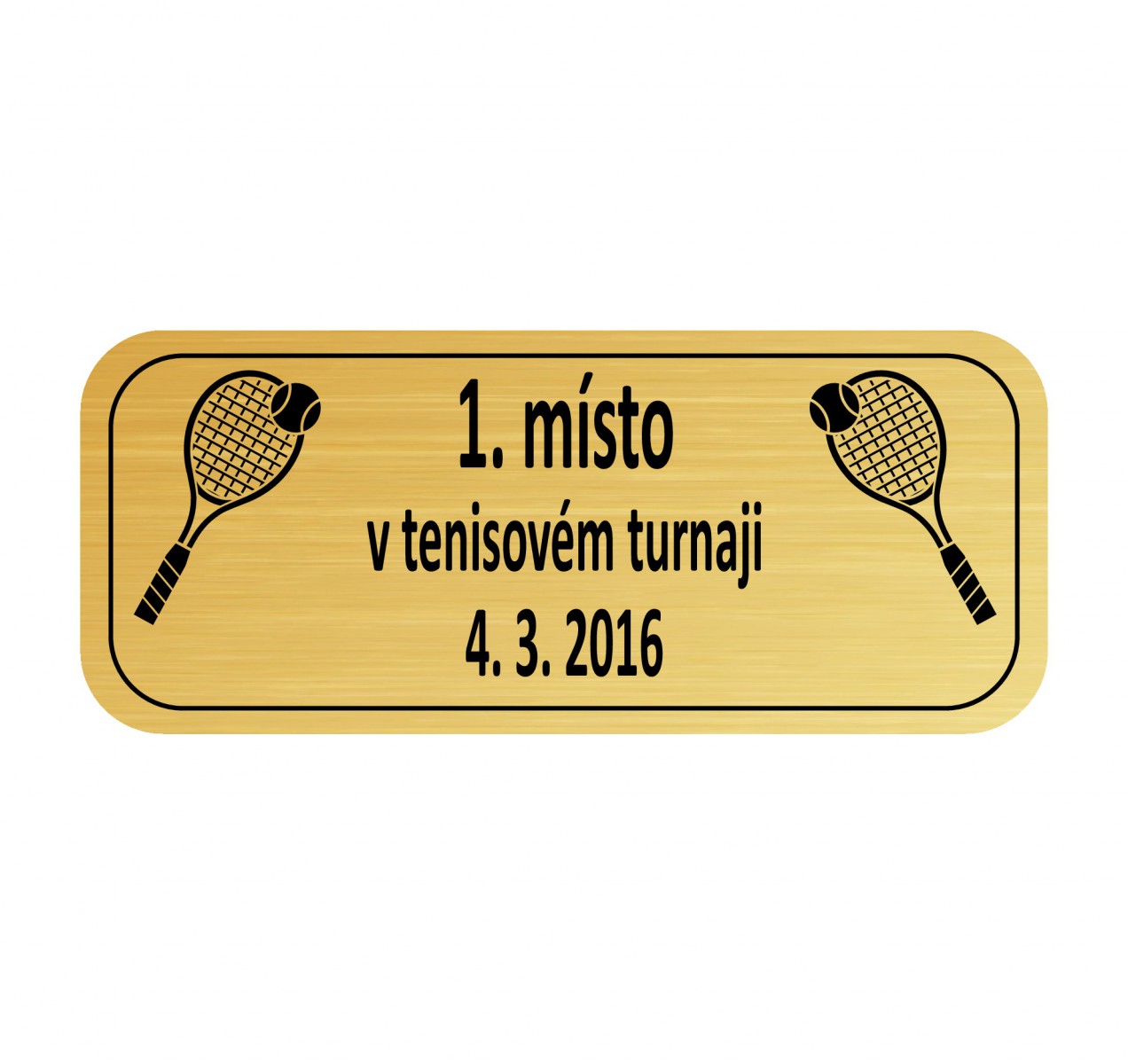 Štítek laserový L01 zlato s kulatými rohy. Jedná se o zlatou samolepicí fólii o rozměrech 70 x 25 mm, síla fólie je 0,2 mm s černým laserovým gravírováním dle Vašich požadavků. Na tyto štítky lze umístnit logo dle Vašeho návrhu nebo obrázek. Laserové štítky se umísťují na přední stranu podstavce poháru, plaket nebo sošek.