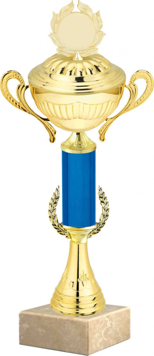 Pohár S008.3 BLUE s víkem, barva zlatá, výška s víkem 45 cm, velikost kalichu 150 mm s terčem 50 mm s možností umístění emblému 50 mm, barva nohy modrá. Maximální velikost potisku štítku na podstavec je 75 x 25 mm.
