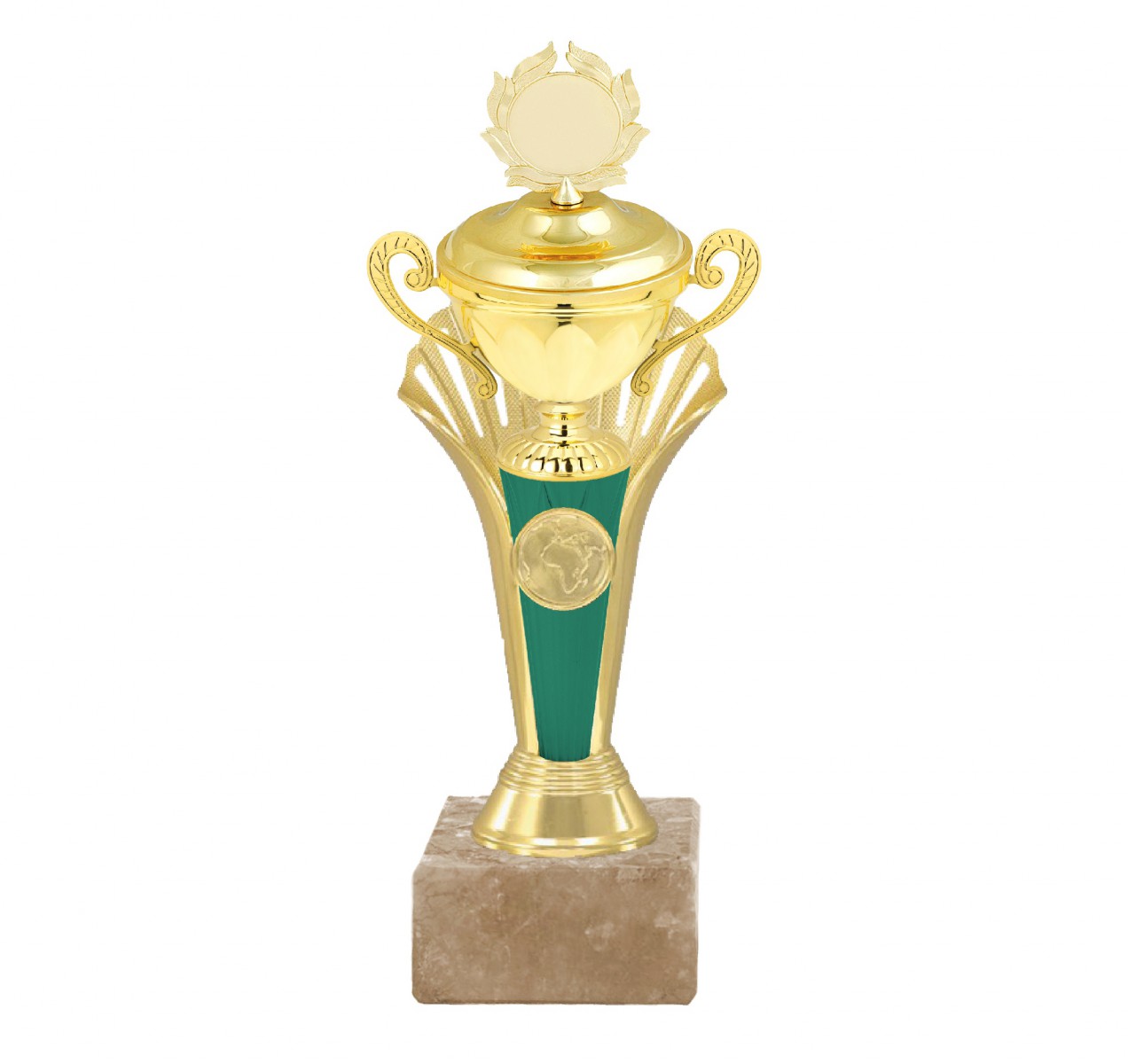 Sportovní pohár S003.3 s víkem, barva zlatá, výška s víkem 31 cm, velikost kalichu 120 mm s terčem 25 mm s možností umístění emblému 25 mm a s možností umístění emblému 25 mm do nohy. Maximální velikost potisku štítku na podstavec je 60 x 25 mm.