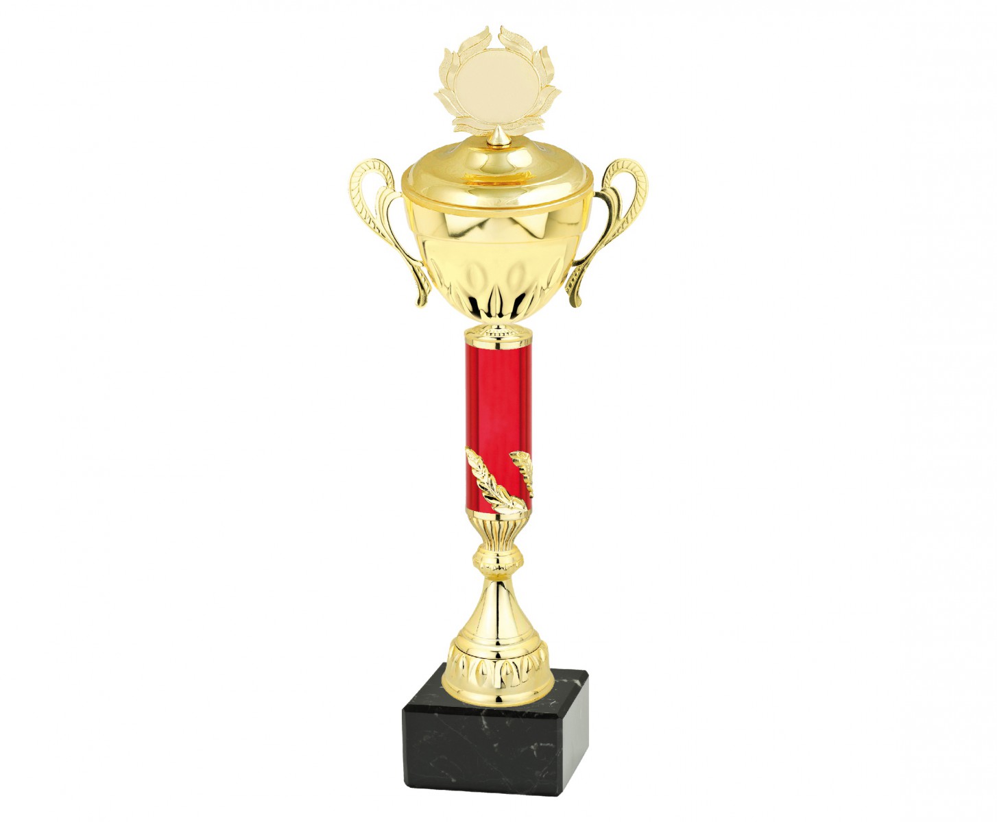 Barva zlatá, výška s víkem 53 cm, velikost kalichu 140 mm s terčem 50 mm, barva nohy červená. Maximální velikost potisku štítku na podstavec je 95 x 45 mm.