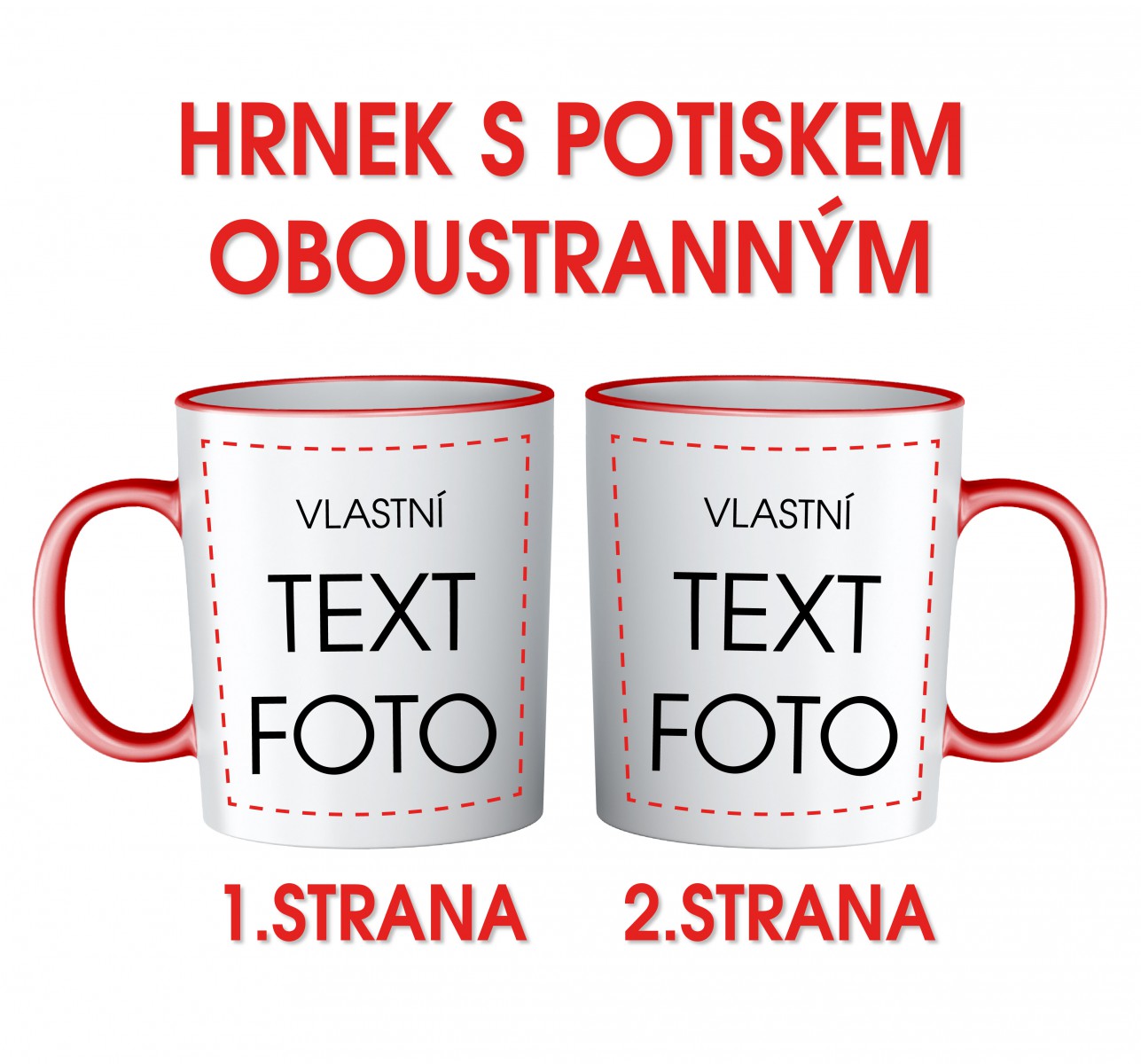 Bílý keramický hrnek s červeným vnitřkem oboustranný potisk. V ceně výrobku je bílý keramický hrnek pro sublimační potisk a samotný potisk vlastním motivem. Potisk hrnků je kvalitní a stálý, provádí se přímou sublimací do glazury, což zaručuje neomezenou životnost potisku, neoloupe se jako běžné potisky. Technologie sublimačního tisku umožňuje plnobarevné provedení - fotopotisk, kvalita výsledného potisku je však závislá na kvalitě dodané fotografie! Rozměr potisku 80 mm (výška) x 200 mm (obvod), objem 330 ml. Hrnky mají certifikát o hygienické nezávadnosti. Ideální dárek pro nejrůznější příležitosti. Vložte fotku se svým oblíbeným obrázkem nebo fotkou a my ji ručně upravíme a přizpůsobíme velikosti hrnečku a můžete obrázek doplnit o text, věnování nebo přání.