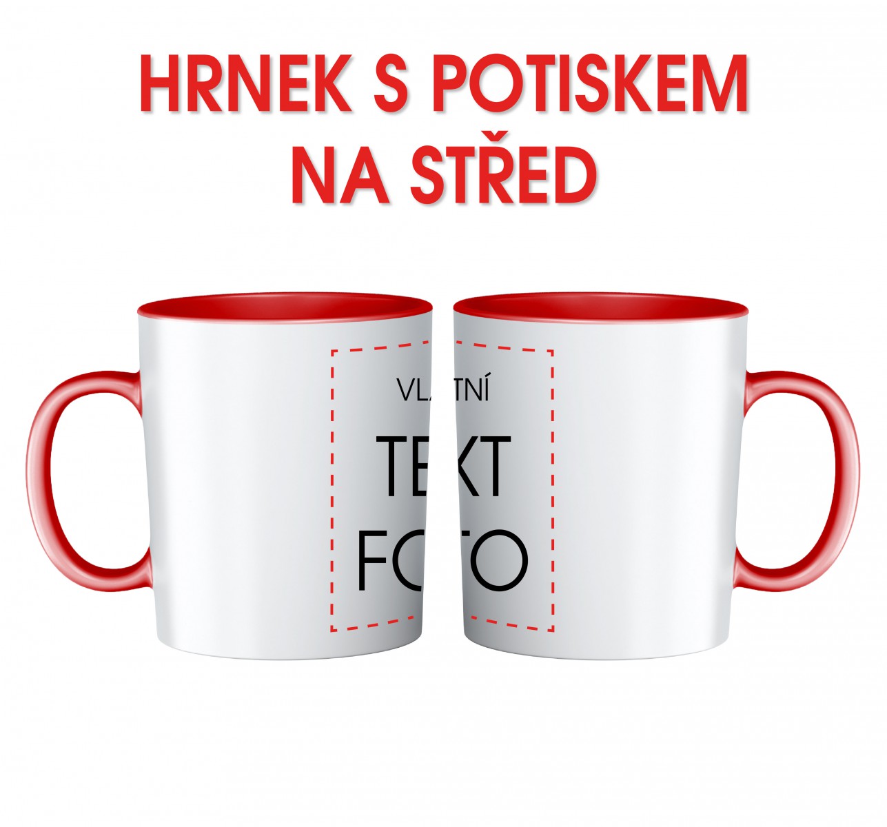 Bílý keramický s červeným vnitřkem a uchem na střed s jednostranným potiskem. V ceně výrobku je bílý keramický hrnek včetně potisku vlastním motivem.