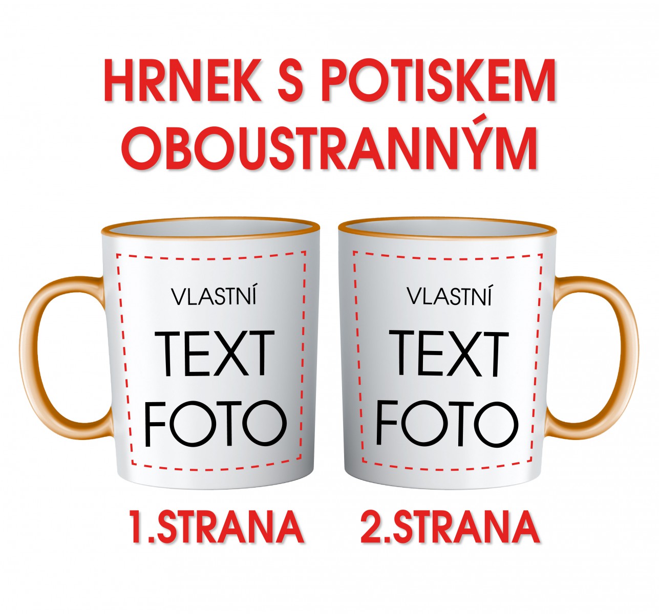Bílý keramický hrnek s oranžovým vnitřkem oboustranný potisk. V ceně výrobku je bílý keramický hrnek pro sublimační potisk a samotný potisk vlastním motivem. Potisk hrnků je kvalitní a stálý, provádí se přímou sublimací do glazury, což zaručuje neomezenou životnost potisku, neoloupe se jako běžné potisky. Technologie sublimačního tisku umožňuje plnobarevné provedení - fotopotisk, kvalita výsledného potisku je však závislá na kvalitě dodané fotografie! Rozměr potisku 80 mm (výška) x 200 mm (obvod), objem 330 ml. Hrnky mají certifikát o hygienické nezávadnosti. Ideální dárek pro nejrůznější příležitosti. Vložte fotku se svým oblíbeným obrázkem nebo fotkou a my ji ručně upravíme a přizpůsobíme velikosti hrnečku a můžete obrázek doplnit o text, věnování nebo přání.