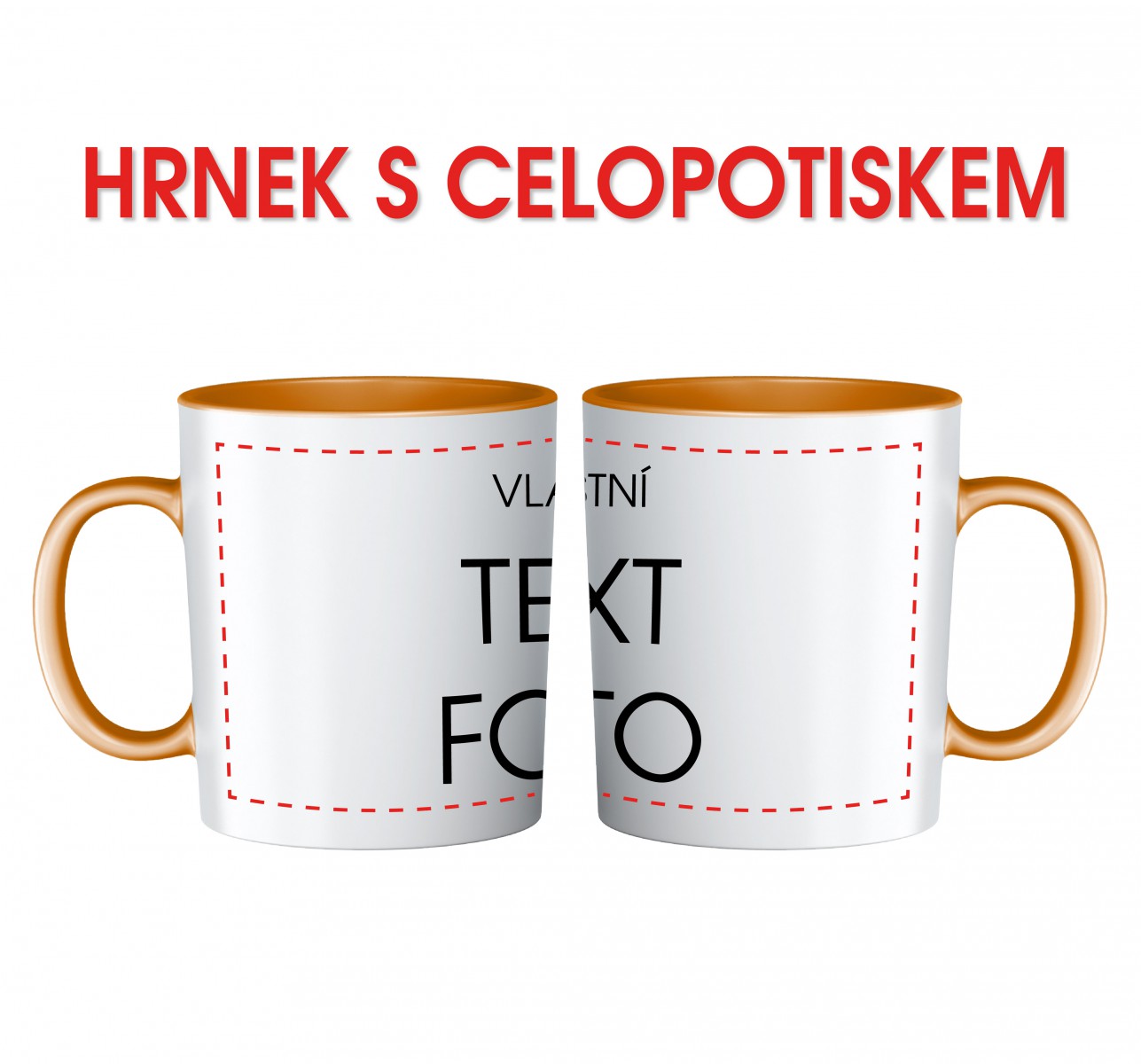 Bílý keramický hrnek s oranžovým vnitřkem a uchem celopotisk. V ceně výrobku je bílý keramický hrnek včetně potisku vlastním motivem.