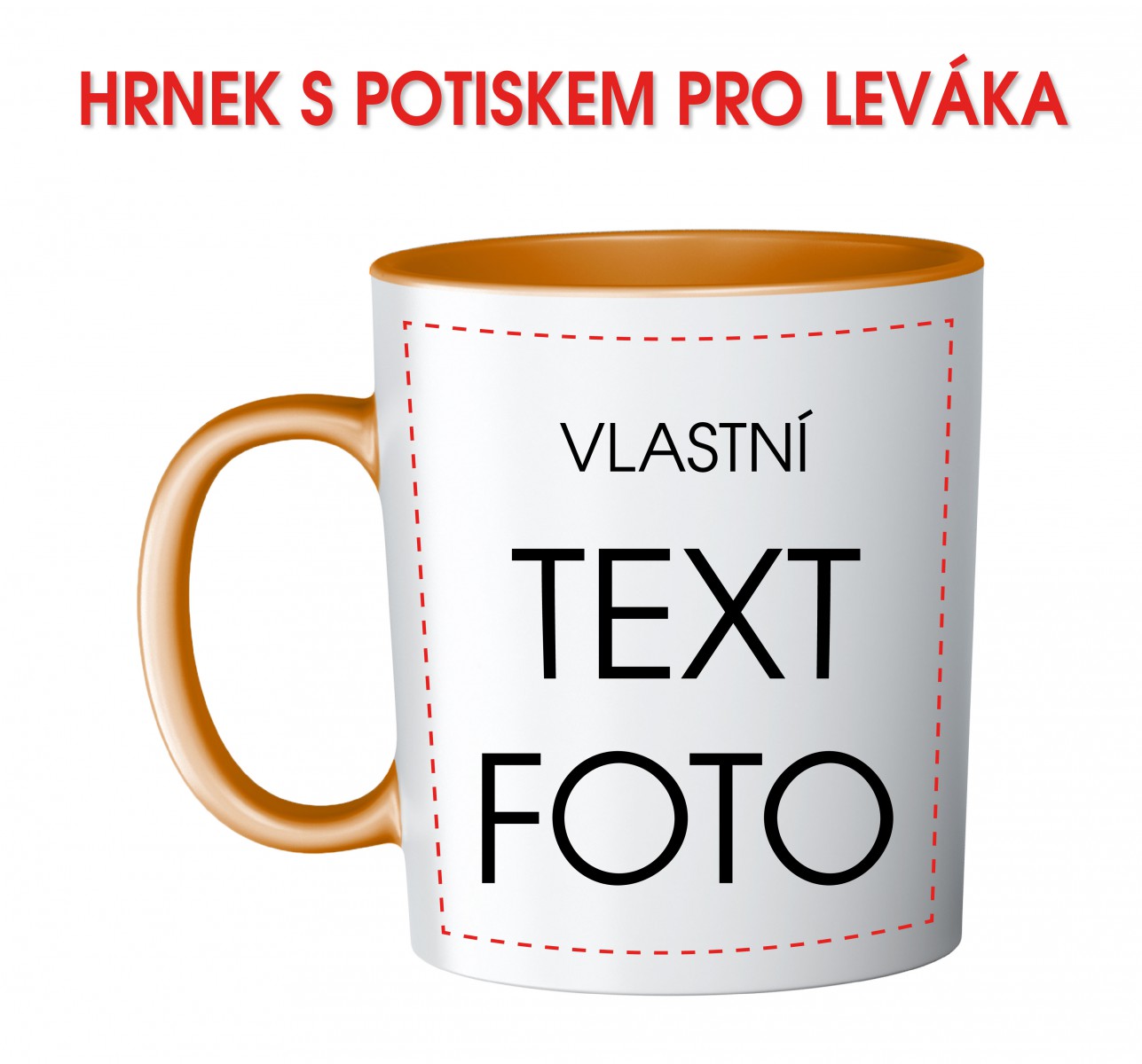 Bílý keramický s oranžovým vnitřkem a uchem na leváka s jednostranným potiskem. V ceně výrobku je bílý keramický hrnek včetně potisku vlastním motivem.