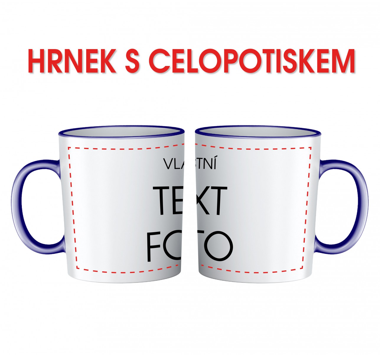 Bílý keramický hrnek s tmavě modrým lemem a uchem celopotisk. V ceně výrobku je bílý keramický hrnek včetně potisku vlastním motivem.