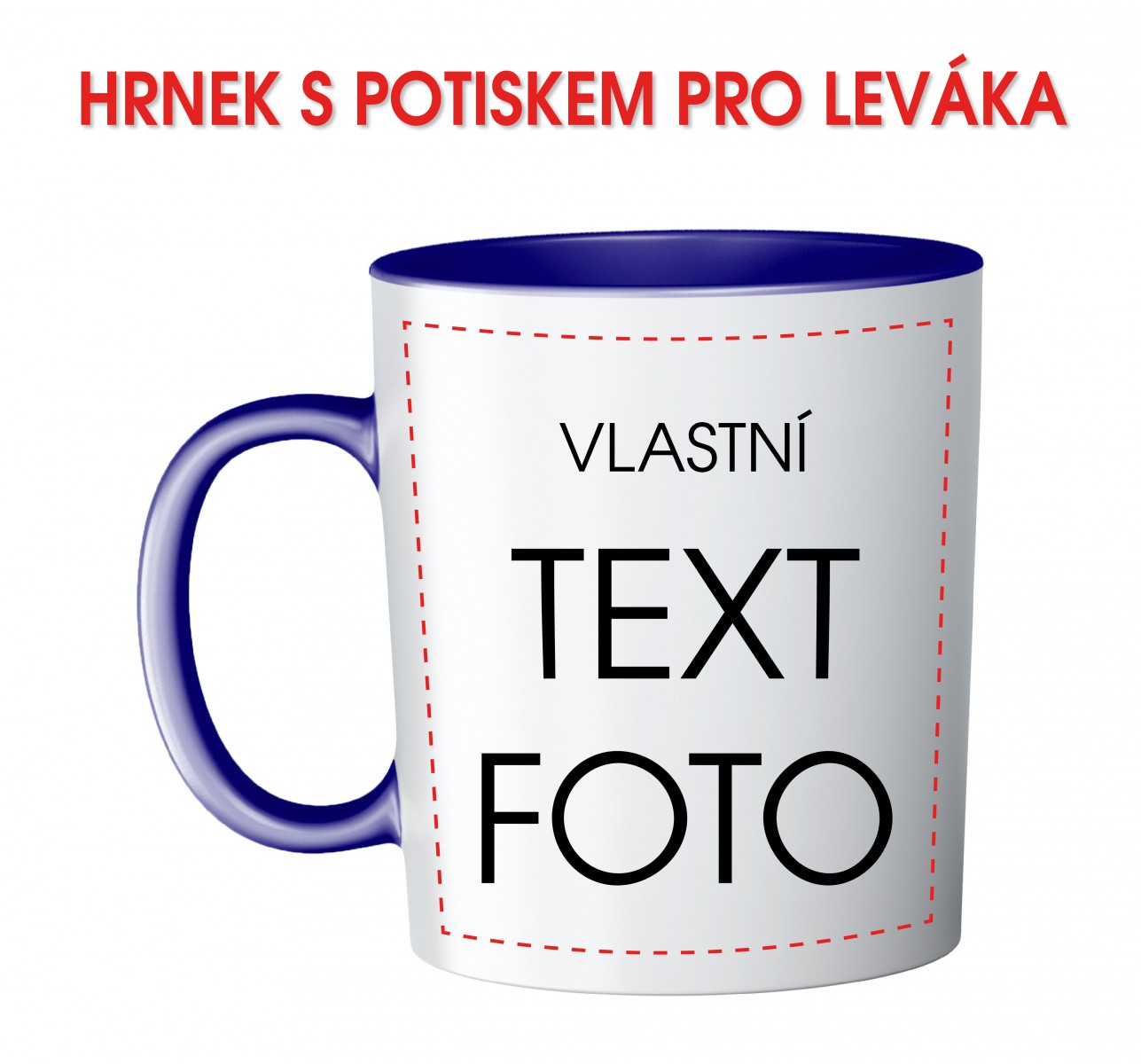 Bílý keramický s tmavě modrým vnitřkem a uchem na leváka s jednostranným potiskem. V ceně výrobku je bílý keramický hrnek pro sublimační potisk a samotný potisk vlastním motivem. Potisk hrnků je kvalitní a stálý, provádí se přímou sublimací do glazury, což zaručuje neomezenou životnost potisku, neoloupe se jako běžné potisky. Technologie sublimačního tisku umožňuje plnobarevné provedení - fotopotisk, kvalita výsledného potisku je však závislá na kvalitě dodané fotografie! Rozměr potisku 80 mm (výška) x 200 mm (obvod), objem 330 ml. Hrnky mají certifikát o hygienické nezávadnosti. Ideální dárek pro nejrůznější příležitosti. Vložte fotku se svým oblíbeným obrázkem nebo fotkou a my ji ručně upravíme a přizpůsobíme velikosti hrnečku a můžete obrázek doplnit o text, věnování nebo přání.