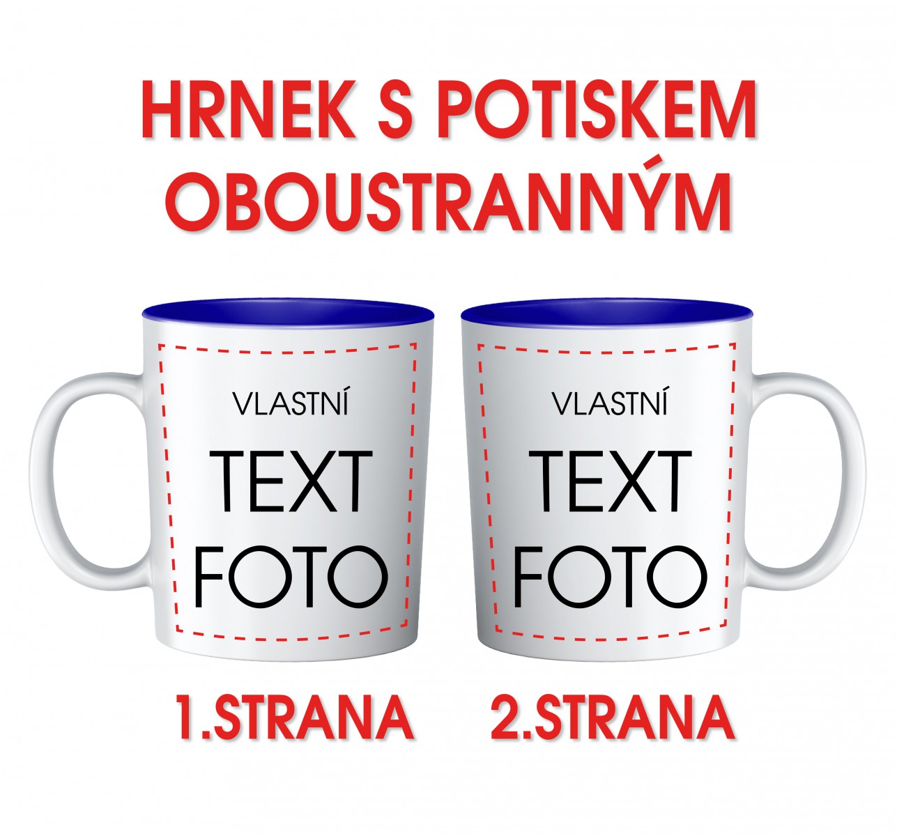 Bílý keramický hrnek s tmavě modrým vnitřkem oboustranný potisk. V ceně výrobku je bílý keramický hrnek pro sublimační potisk a samotný potisk vlastním motivem. Potisk hrnků je kvalitní a stálý, provádí se přímou sublimací do glazury, což zaručuje neomezenou životnost potisku, neoloupe se jako běžné potisky. Technologie sublimačního tisku umožňuje plnobarevné provedení - fotopotisk, kvalita výsledného potisku je však závislá na kvalitě dodané fotografie! Rozměr potisku 80 mm (výška) x 200 mm (obvod), objem 330 ml. Hrnky mají certifikát o hygienické nezávadnosti. Ideální dárek pro nejrůznější příležitosti. Vložte fotku se svým oblíbeným obrázkem nebo fotkou a my ji ručně upravíme a přizpůsobíme velikosti hrnečku a můžete obrázek doplnit o text, věnování nebo přání.