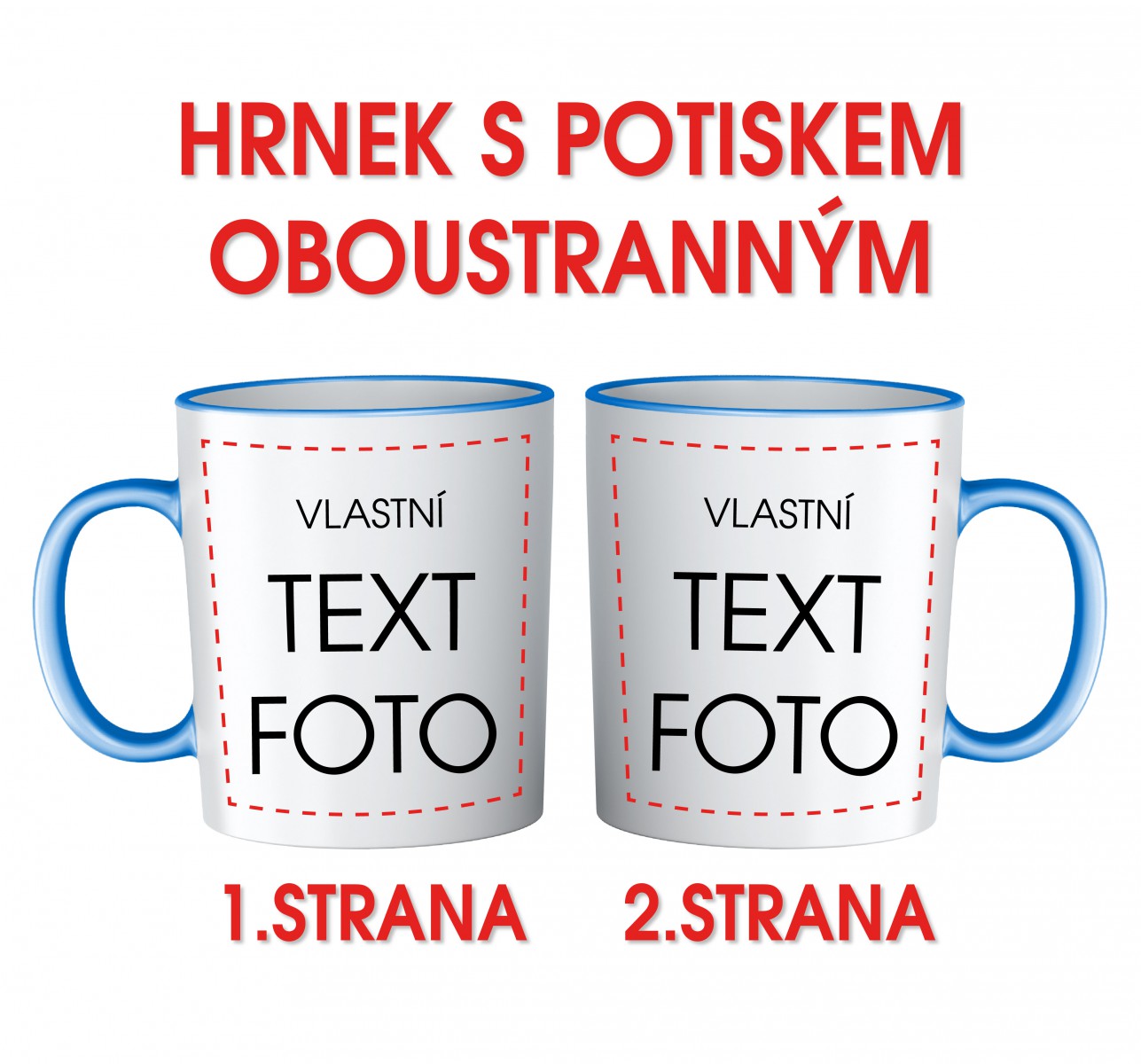 Bílý keramický hrnek se světle modrým vnitřkem oboustranný potisk. V ceně výrobku je bílý keramický hrnek pro sublimační potisk a samotný potisk vlastním motivem. Potisk hrnků je kvalitní a stálý, provádí se přímou sublimací do glazury, což zaručuje neomezenou životnost potisku, neoloupe se jako běžné potisky. Technologie sublimačního tisku umožňuje plnobarevné provedení - fotopotisk, kvalita výsledného potisku je však závislá na kvalitě dodané fotografie! Rozměr potisku 80 mm (výška) x 200 mm (obvod), objem 330 ml. Hrnky mají certifikát o hygienické nezávadnosti. Ideální dárek pro nejrůznější příležitosti. Vložte fotku se svým oblíbeným obrázkem nebo fotkou a my ji ručně upravíme a přizpůsobíme velikosti hrnečku a můžete obrázek doplnit o text, věnování nebo přání.