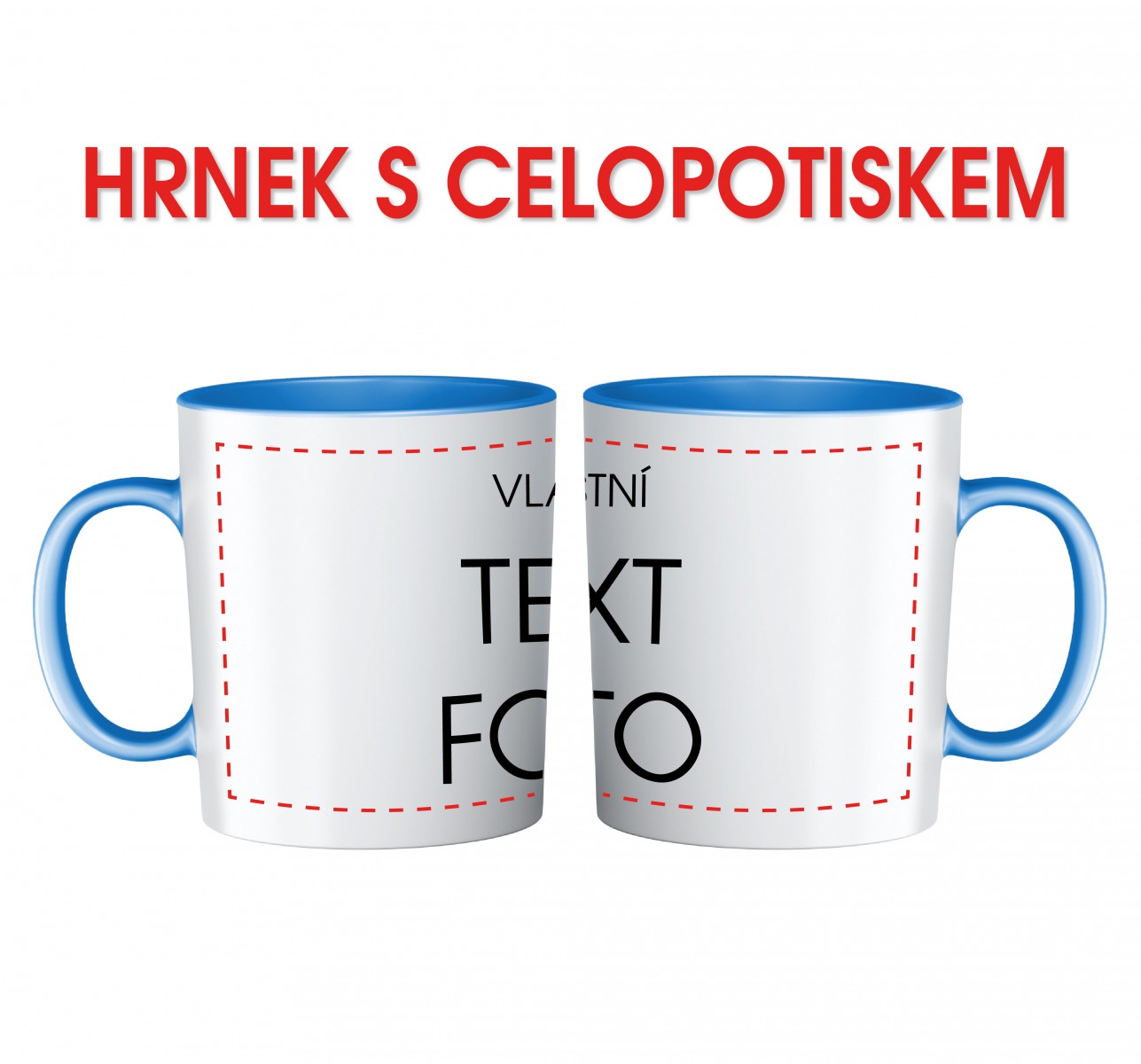 Bílý keramický hrnek se světle modrým vnitřkem a uchem celopotisk. V ceně výrobku je bílý keramický hrnek včetně potisku vlastním motivem.