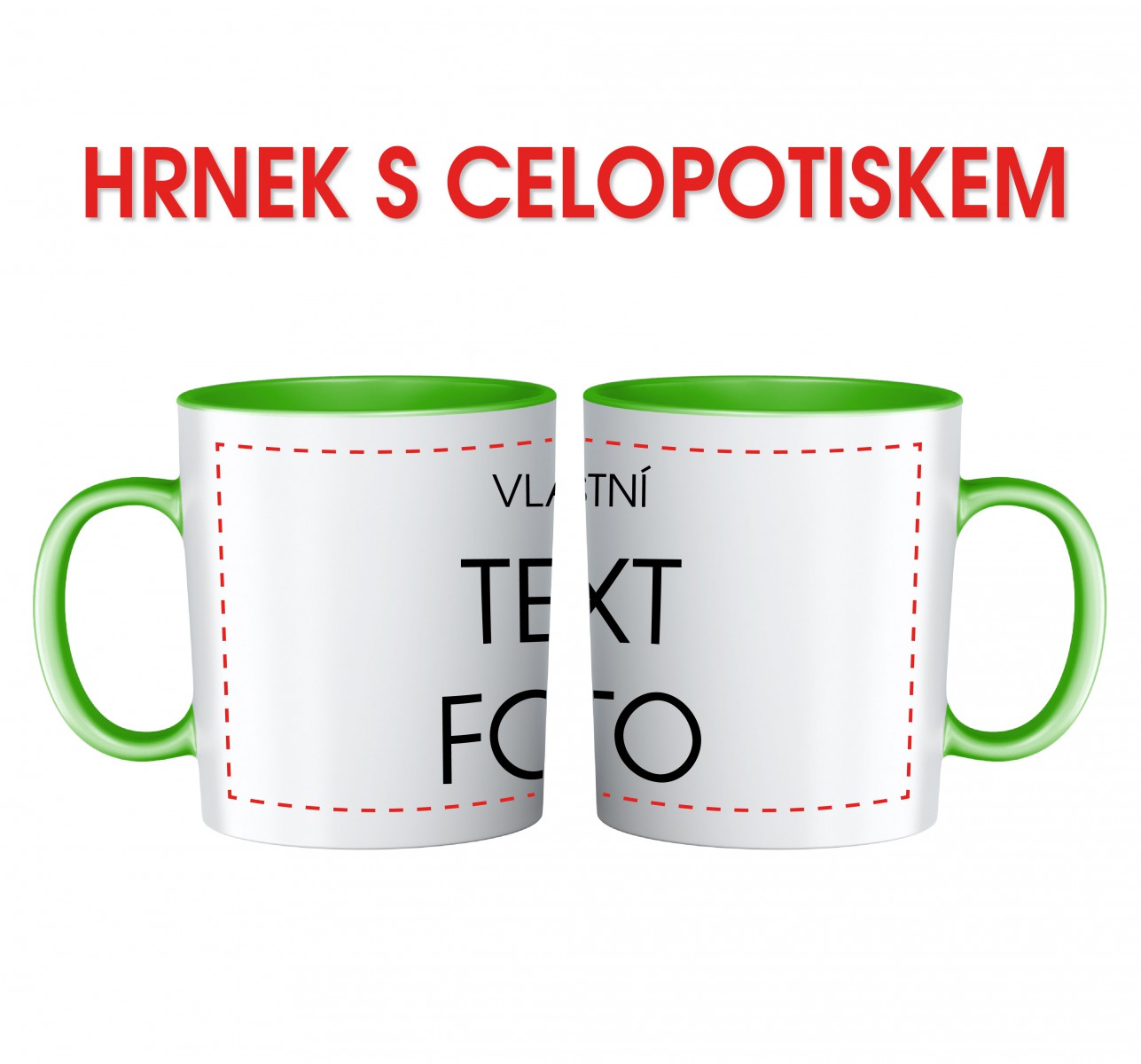 Bílý keramický hrnek se světle zeleným vnitřkem a uchem celopotisk. V ceně výrobku je bílý keramický hrnek včetně potisku vlastním motivem.