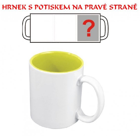 Bílý keramický s žlutým vnitřkem. Hrnek je potištěný z jedné strany s Vaším potiskem sublimací do glazury. V ceně výrobku je keramický hrnek pro sublimační potisk a samotný potisk vlastním motivem.