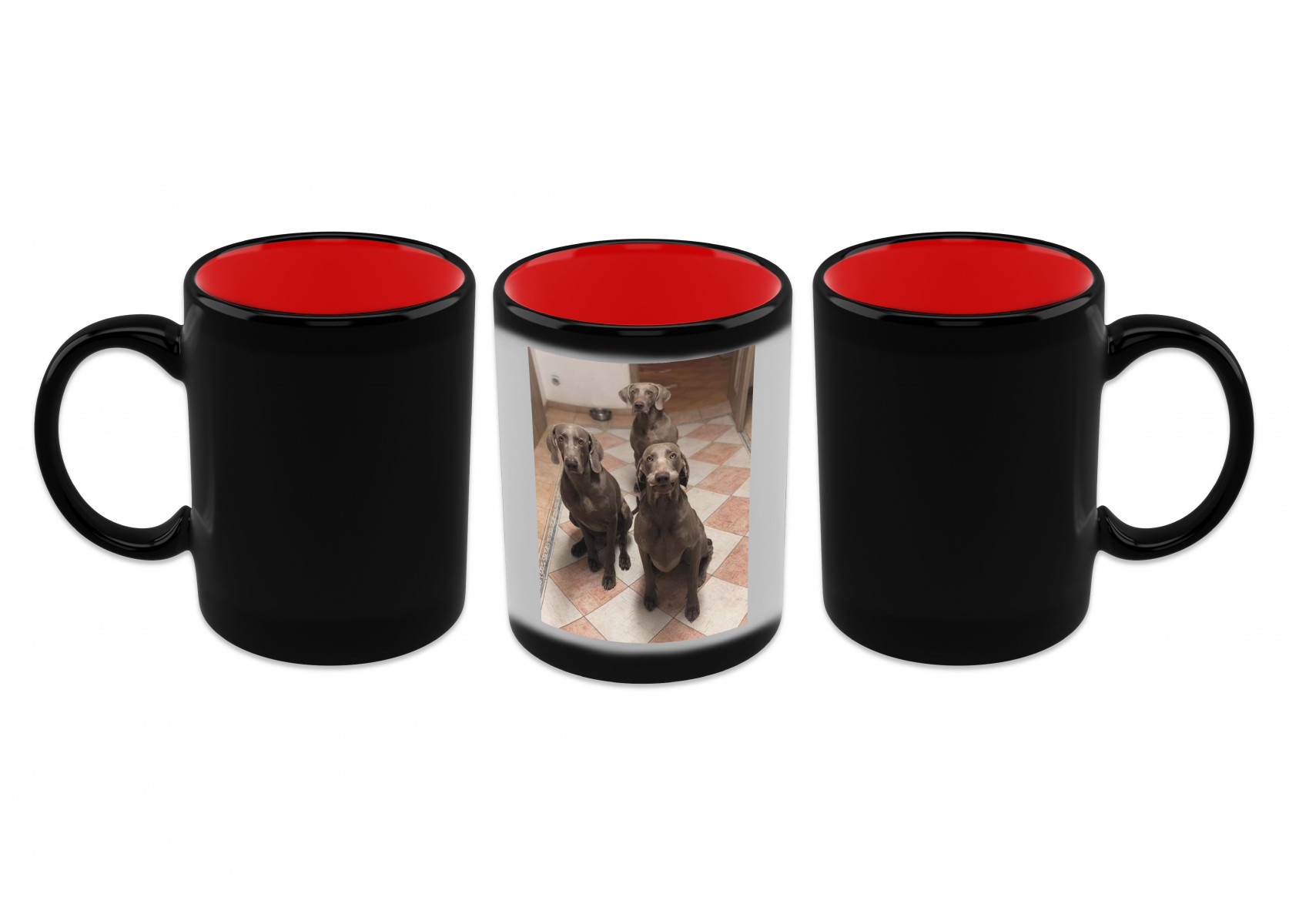 Hrnek MAGIC černý s červeným vnitřkem působením horkého nápoje odhalí tento hrnek s natištěnou fotku či obrázek. Potisk se provádí na speciálně upravené hrnky za pomocí tepla a tlaku. Po nalití teplého nápoje barva mizí a zůstane jen Váš potisk. Tento hrnek není vhodný do myčky. Na hrnek je možné umístit fotografie např. rodiny, firemní logo, domací zvířátka atd..
