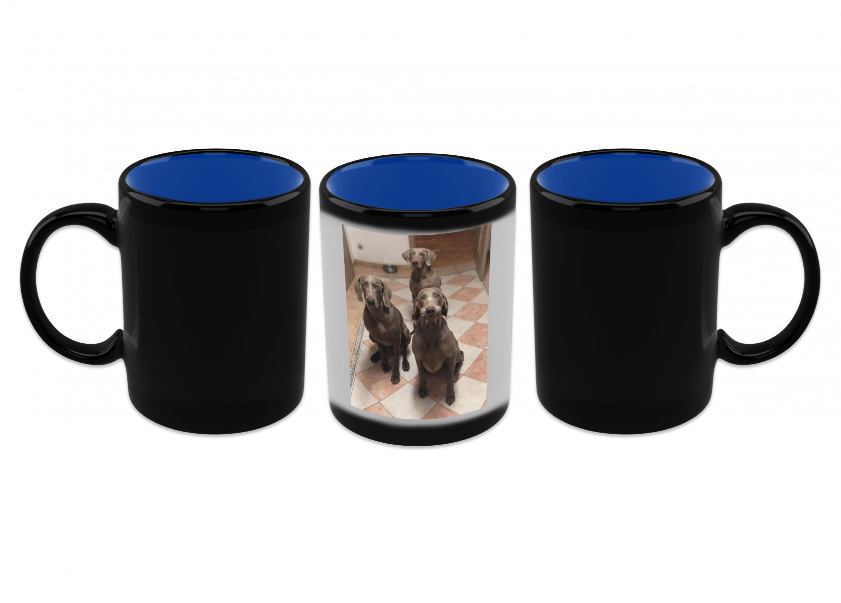 Hrnek MAGIC černý s modrým vnitřkem na střed působením horkého nápoje odhalí tento hrnek s natištěnou fotku či obrázek. Potisk se provádí na speciálně upravené hrnky za pomocí tepla a tlaku. Po nalití teplého nápoje barva mizí a zůstane jen Váš potisk. Tento hrnek není vhodný do myčky. Na hrnek je možné umístit fotografie např. rodiny, firemní logo, domací zvířátka atd..