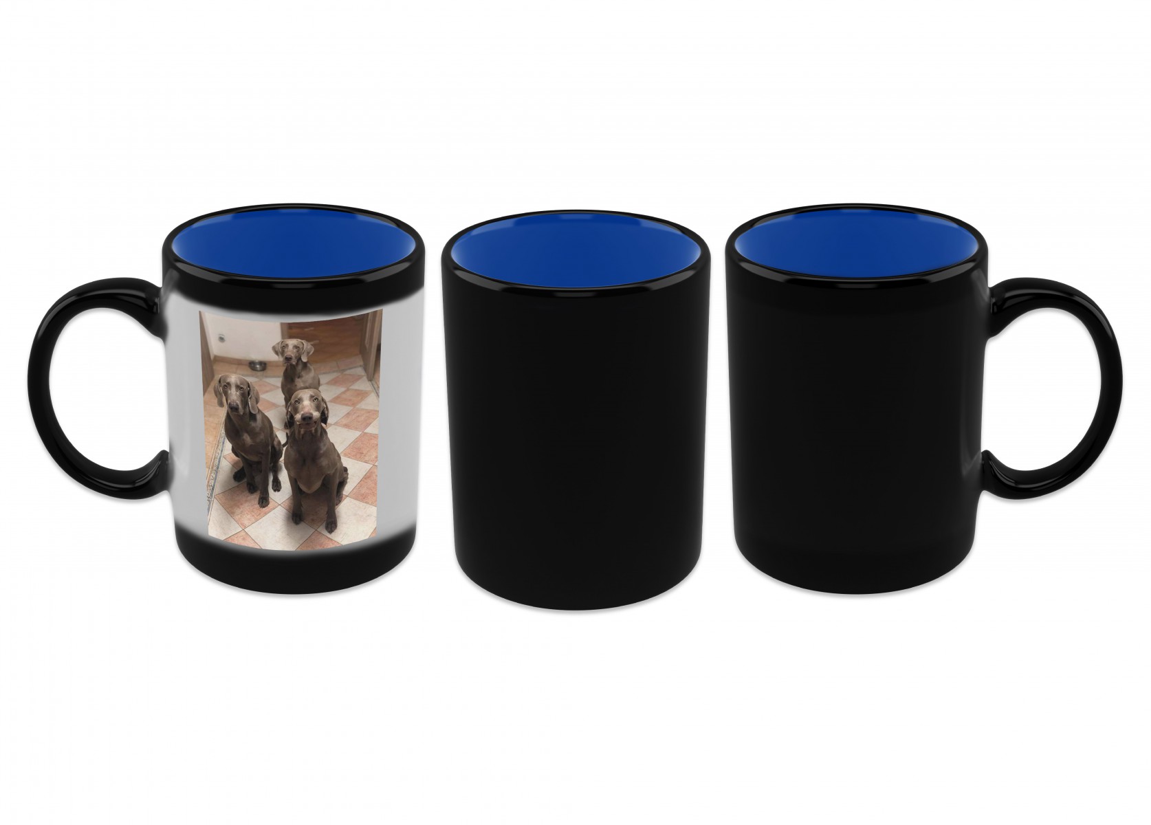 Hrnek MAGIC černý s modrým vnitřkem celopotisk působením horkého nápoje odhalí tento hrnek s natištěnou fotku či obrázek. Potisk se provádí na speciálně upravené hrnky za pomocí tepla a tlaku. Po nalití teplého nápoje barva mizí a zůstane jen Váš potisk. Tento hrnek není vhodný do myčky. Na hrnek je možné umístit fotografie např. rodiny, firemní logo, domací zvířátka atd..
