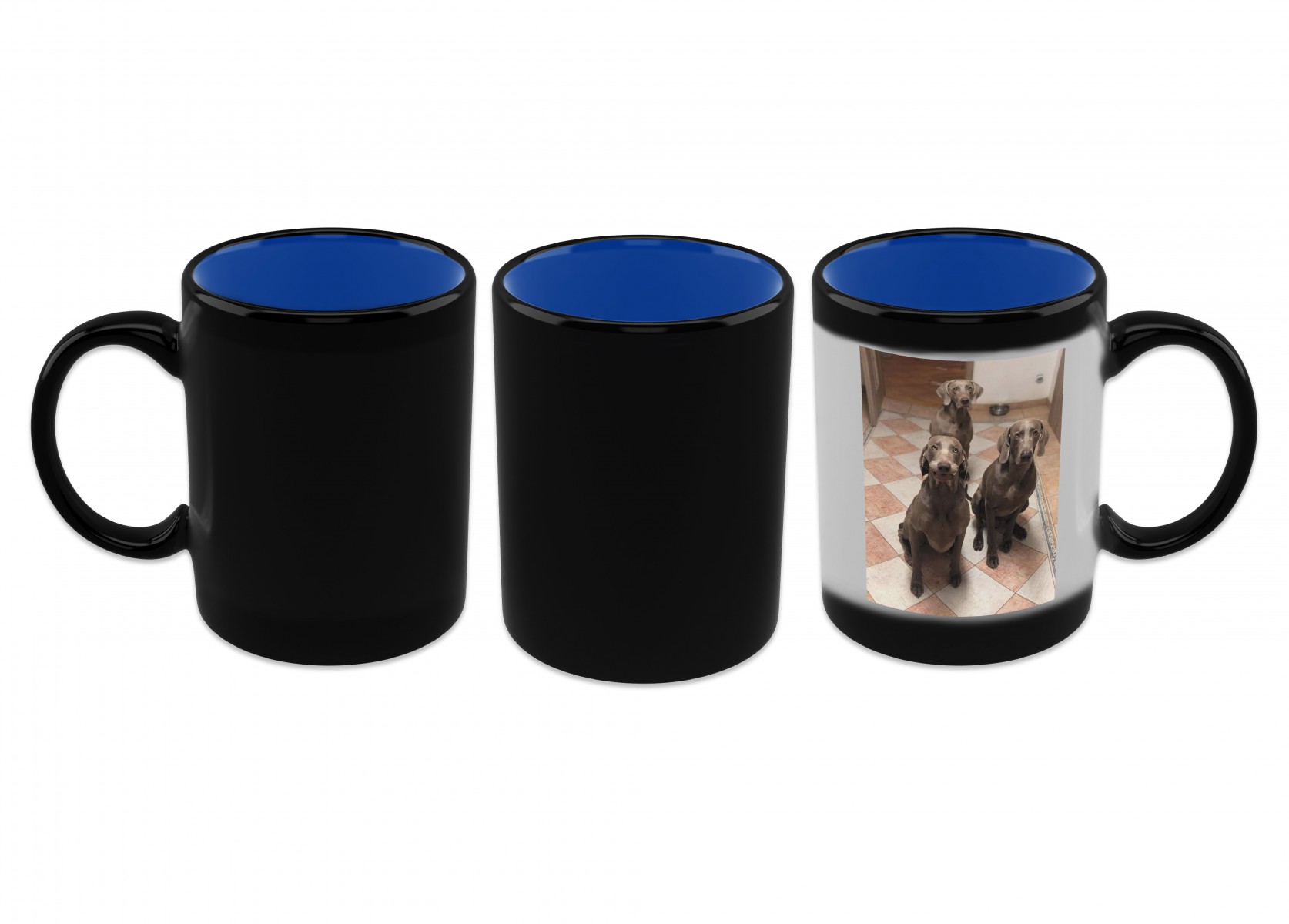 Hrnek MAGIC černý s modrým vnitřkem pro praváka působením horkého nápoje odhalí tento hrnek s natištěnou fotku či obrázek. Potisk se provádí na speciálně upravené hrnky za pomocí tepla a tlaku. Po nalití teplého nápoje barva mizí a zůstane jen Váš potisk. Tento hrnek není vhodný do myčky. Na hrnek je možné umístit fotografie např. rodiny, firemní logo, domací zvířátka atd..