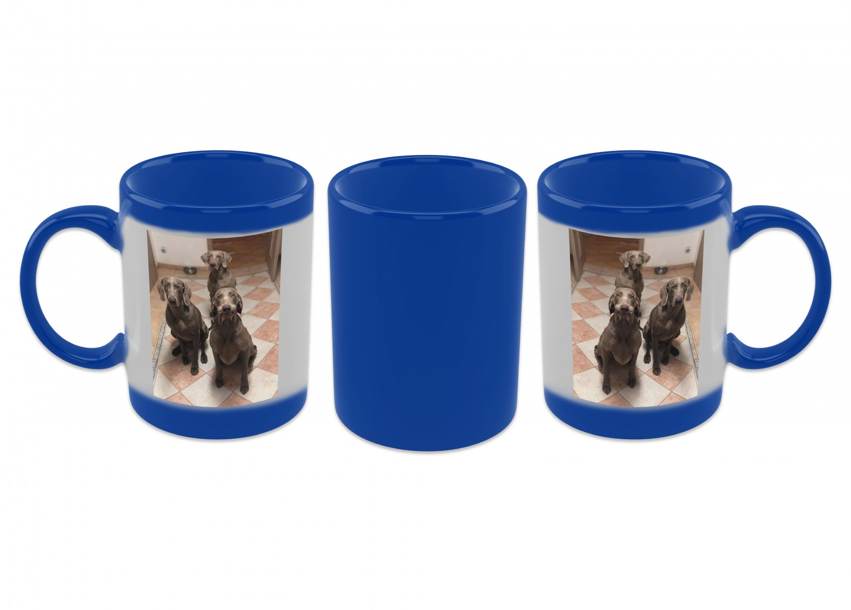 Hrnek MAGIC modrý oboustranný působením horkého nápoje odhalí tento hrnek s natištěnou fotku či obrázek. Potisk se provádí na speciálně upravené hrnky za pomocí tepla a tlaku. Po nalití teplého nápoje barva mizí a zůstane jen Váš potisk. Tento hrnek není vhodný do myčky. Na hrnek je možné umístit fotografie např. rodiny, firemní logo, domací zvířátka atd..